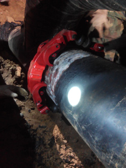 當(dāng)晚,從晚上18點開挖作業(yè)坑,由煤氣公司管線所負責(zé)人籍所長現(xiàn)場指導(dǎo)工作,直至凌晨一點,閥井全部挖開。客戶采用雙向供氣模式,臨時關(guān)閉需更換閥門兩端的閥門,打開放散空放散管道余氣,去除陳舊閥門螺帽和螺栓,處理管道表面PE防腐層,切割前準(zhǔn)備工作做好后,搶險隊同志們按照步驟安裝我司旋轉(zhuǎn)式切管機ECR12,進刀、旋轉(zhuǎn)、不停進刀,不到二十分鐘時間把DN300鋼管順利切斷,整個切割過程實現(xiàn)了無火花,斷口筆直、無碎屑,更省力,使切開后的管道余氣自然排放,避免了動火切割帶來的潛在危險。 隨后,搶維修隊的隊員們按照計劃更換閥門,直至凌晨六點鐘搶維修工作才圓滿結(jié)束。事后,晉中煤氣公司管線所長及搶維修隊對我司管道冷切割工具給予很高評價,同時,能為幫助客戶解決問題,我們感到尤為的榮幸,這標(biāo)志著我司產(chǎn)品質(zhì)量受到客戶的認(rèn)可與肯定!