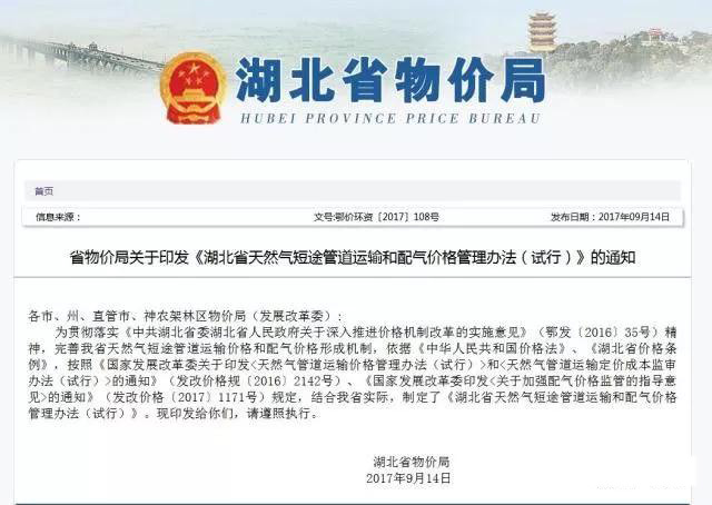 2017年發(fā)改委《關(guān)于核定天然氣跨省管道運輸價格的通知》,根據(jù)《天然氣管道運輸價格管理辦法(試行)》和《天然氣管道運輸定價成本監(jiān)審辦法(試行)》有關(guān)規(guī)定,對中石油北京天然氣管道有限公司等13家跨省管道運輸企業(yè)進行了定價成本監(jiān)審,核定了中石油北京天然氣管道有限公司等13家跨省管道運輸企業(yè)管道運輸價格。自2017年9月1日起執(zhí)行。